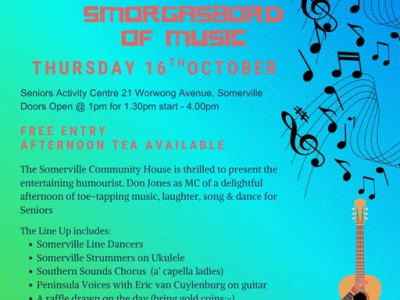 Come along and see Southern Sounds Chorus and other Somerville Community House Music groups perform on Oct 16 for The Mornington Peninsula Seniors Festival. Free! Phone 5977 8330 (Kim) to book.